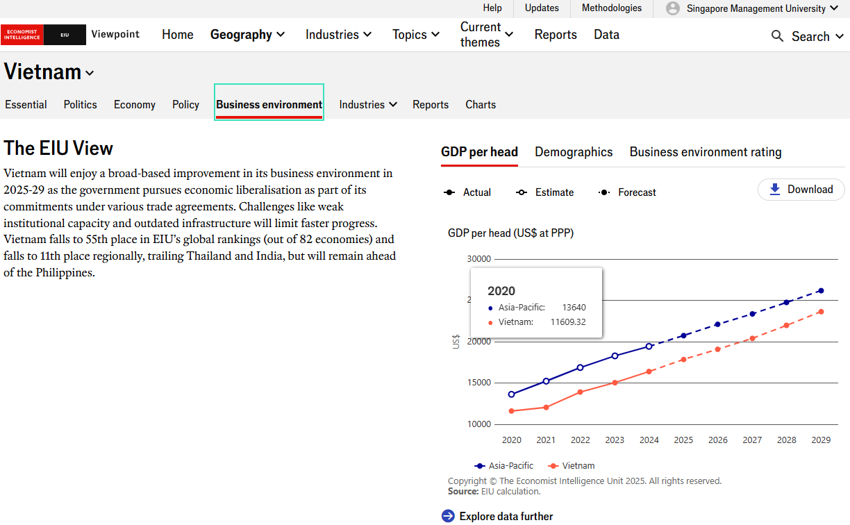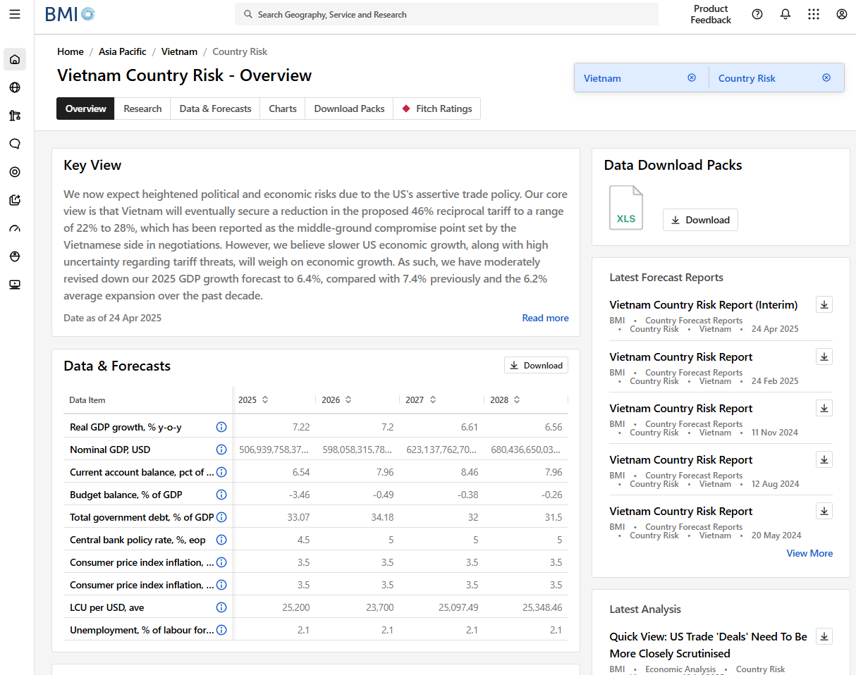 Using Vietnam as an example - the following country risk analysis from Fitch Connect can obtained: