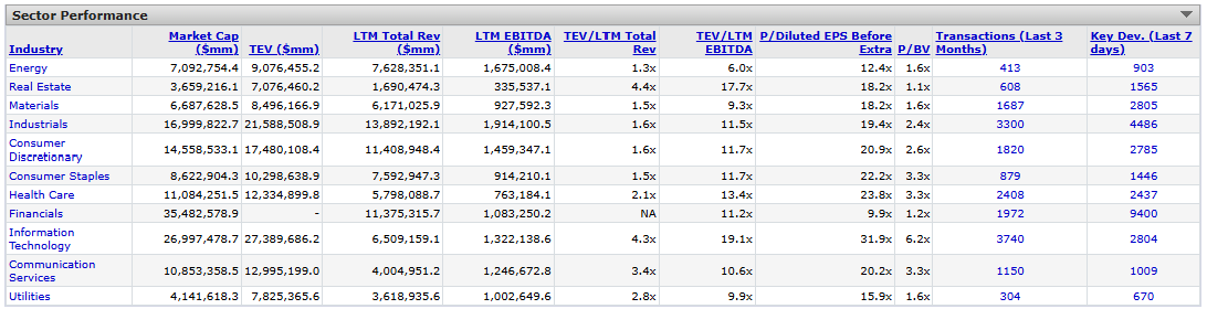 Databases such as Capital IQ give industry data by sector performance. The following screengrab illustrates this: