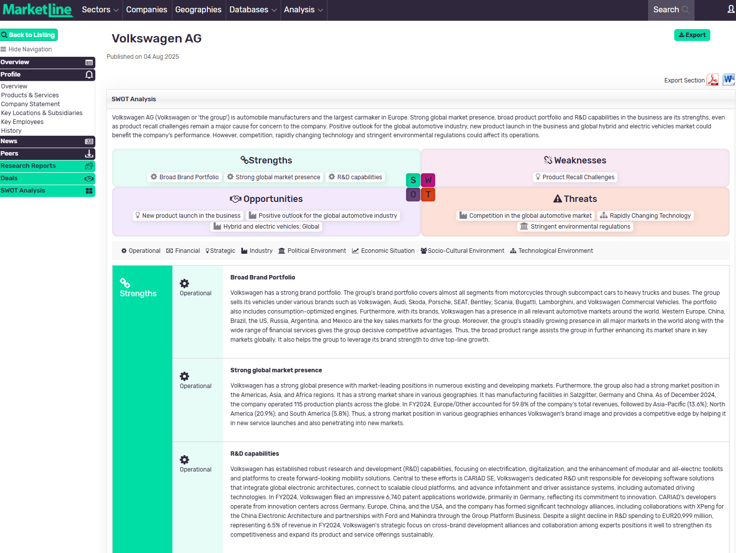 Some databases such as MarketLine provide company-level SWOT analysis, others like CrunchBase will give details of investments size (funding) for start-ups.